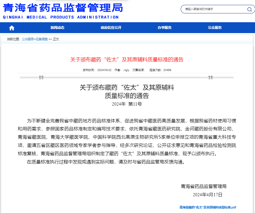 為推進藏醫藥高質量發展,解決藏藥材質量標準體系不完善的問題,青海省依托重大科技專項,參照國家藥品標準制定規范,系統構建了藏藥原輔料質量標準化體系。其中,藏藥“佐太”及其原輔料質量標準的頒布實施,首次建立了該關鍵藥材的炮制規范和質量控制標準,填補了藏醫藥學在該領域的空白,為藏醫藥標準化建設奠定了堅實基礎。下一步將重點推進內控炮制規范的起草工作。