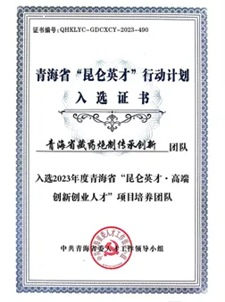 金訶藏藥炮制傳承創新團隊榮獲2023年度青海省“昆侖英才·高端創新創業人才”項目培養團隊入選證書