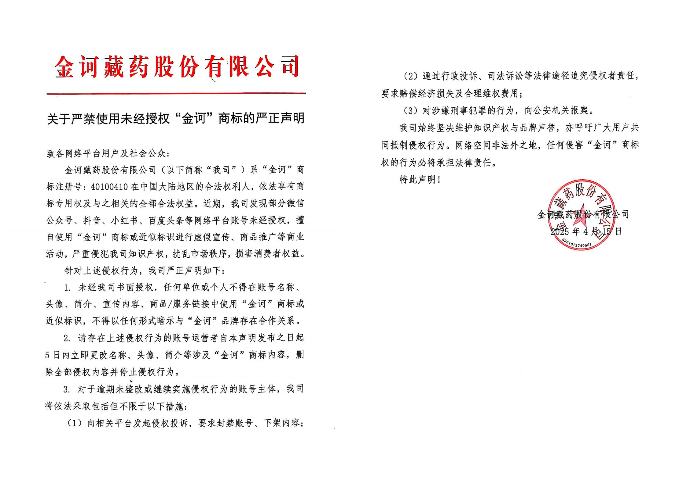關于嚴禁使用未經授權“金訶”商標的嚴正聲明