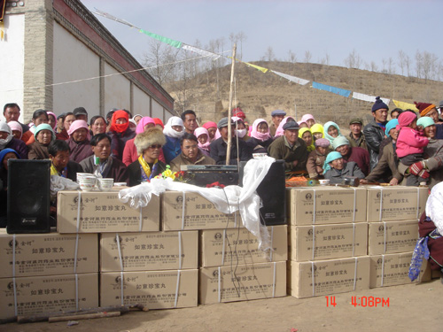 5/19 支持基層醫療建設 2007年5月19日,金訶藏藥聯合青海省藏醫院為化隆縣金源鄉科巴村的丹斗寺利眾診所無償捐獻價值九萬元的二十多種藥品,支持鄉村衛生醫療建設。